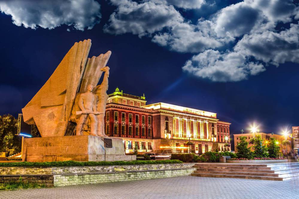 Dąbrowa Górnicza pomnik Bohaterów Czerwonych Sztandarów i Pałac Kultury Zagłębia nocą, fot. Marcin Wróblewski archiwum UM w Dąbrowie GórniczejW Pałacu Kultury działa m.in. Galeria Plastyki, Zagłębiowska Scena Muzyczna, Orkiestra Kameralna Zagłębia i kino „Kadr”. W sąsiedztwie pałacu znajduje się pomnik Bohaterów Czerwonych Sztandarów, odsłonięty w 1970 r. W ramach dekomunizacji były już dwukrotne próby jego likwidacji (w 1990 i 2018), ale za każdym razem w jego obronie stawali mieszkańcy (malując m.in. napis: Jimiemu Hendrixowi, Kurtowi Cobainowi, Wszystkim, których kochają wolność).